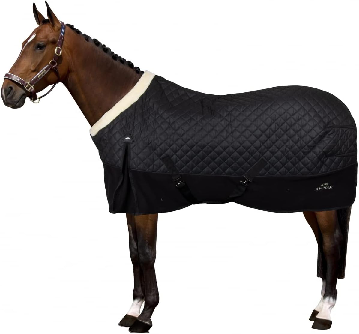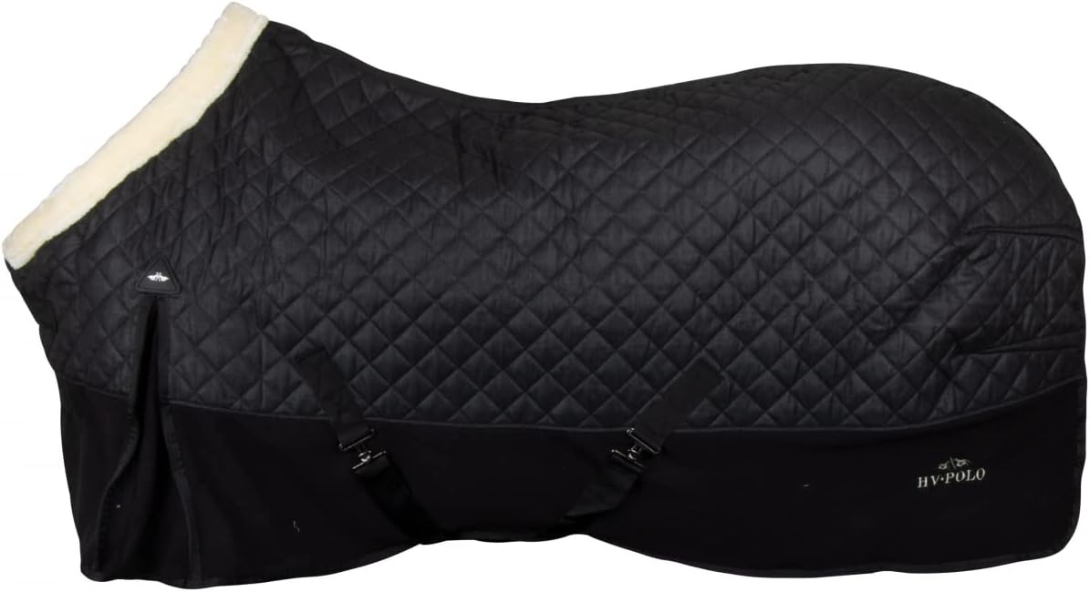 De bovenkant van deze staldeken is gemaakt van wolmateriaal met kleine diamantquilting en de onderkant is gemaakt van fleecemateriaal. De deken heeft een mooie dikke kraag van kunstbont en glanzende satijn-polyesterstof op de bies en de sluitbandjes. Met klein metalen plaatje op de sluiting aan de voorkant en een rubberen badge boven de loopopening. Voorzien van kruissingels op de buik, een dubbele T-sluiting aan de voorkant en een staartkoord.