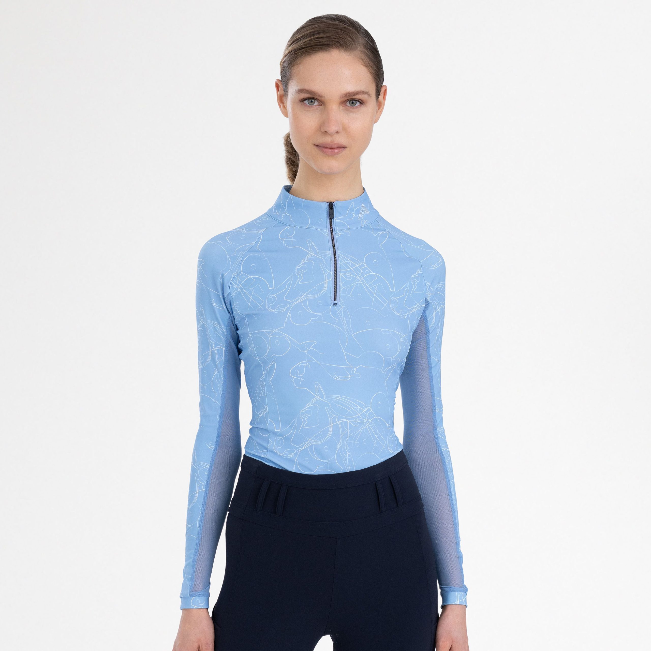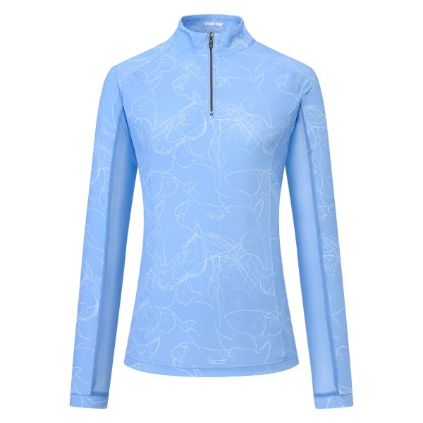 Klaar om je rijprestaties naar een hoger niveau te tillen zonder in te leveren op stijl? De euro-star ESJoline top is jouw perfecte partner in de dressuurring of tijdens een springparcours. Deze innovatieve top met lange mouwen en een all-over print geeft je look een dynamische touch. Dankzij de UV40+ bescherming blijf je beschermd tegen de zon, ideaal voor lange dagen buiten in het zadel. De praktische halve rits met opstaande kraag biedt extra ventilatie wanneer je die nodig hebt en voegt een elegante touch toe. Een subtiel strass paardenhoofdlogo op de linker kraag zorgt voor een vleugje exclusiviteit, terwijl de rubberen ‘EUROSTAR’ print op de rechtermouw de kwaliteit van je kledingkeuze benadrukt. De strategisch geplaatste mesh-inzetstukken onder de oksels en aan de onderzijde van de mouwen zorgen voor optimale ventilatie, zodat je altijd fris en comfortabel blijft, zelfs tijdens intensieve trainingen. De kleine stoffen manchetten aan de mouwen maken het geheel af met een verfijnde afwerking. Voel je zelfverzekerd en comfortabel in deze top, ontworpen voor de gedreven amazone of ruiter die alleen het beste wil.